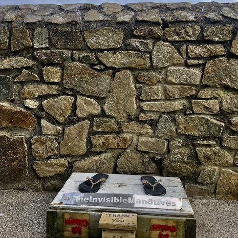 St. Ives', neighbor to Carbis Bay, name recognition became instant with the recent G7. It has long been known as an artist colony. We found some entertaining addresses, like the Lobster's Residence and a creative art "installation" The Invisible Man St. Ives with a donation cup. I hope the world leaders stopped by here for some amusement and discussion.